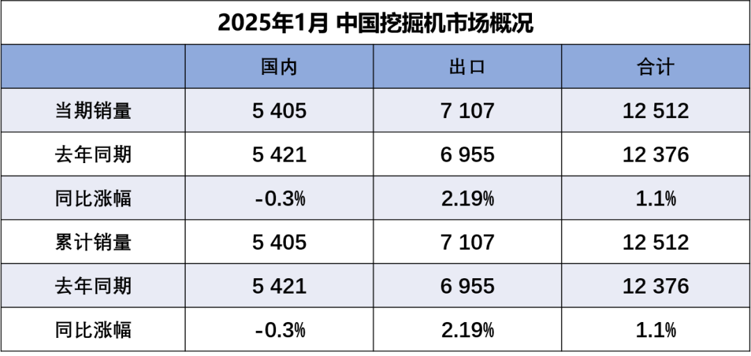 據中國工程機械工業協會對挖掘機主要制造企業統計,2025年1月銷售各類挖掘機12512臺,同比增長1.1%。其中國內銷量5405臺,同比下降0.3%;出口量7107臺,同比增長2.19%。2025年1月…...